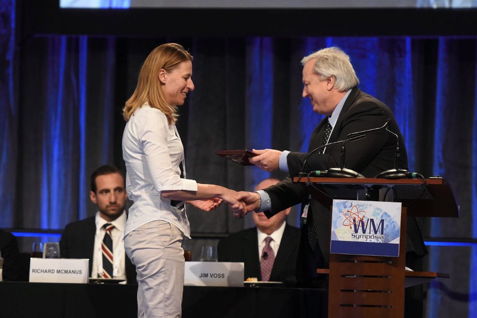 8 "Gary Benda presenting the WM2015 ASME Best Oral Presentation/Paper, ""Uncertainty in Decommissioning, the Benefits of 3D Simulation"" – Track 9, Special Topics & Multi-Track Crosscutting Technology Topics to Sabrine Idihia with OREKA Solutions (Ms. Idihia accepted the award on behalf of Lawrence Wharmby and Luc Ardellier with OREKA Solutions)