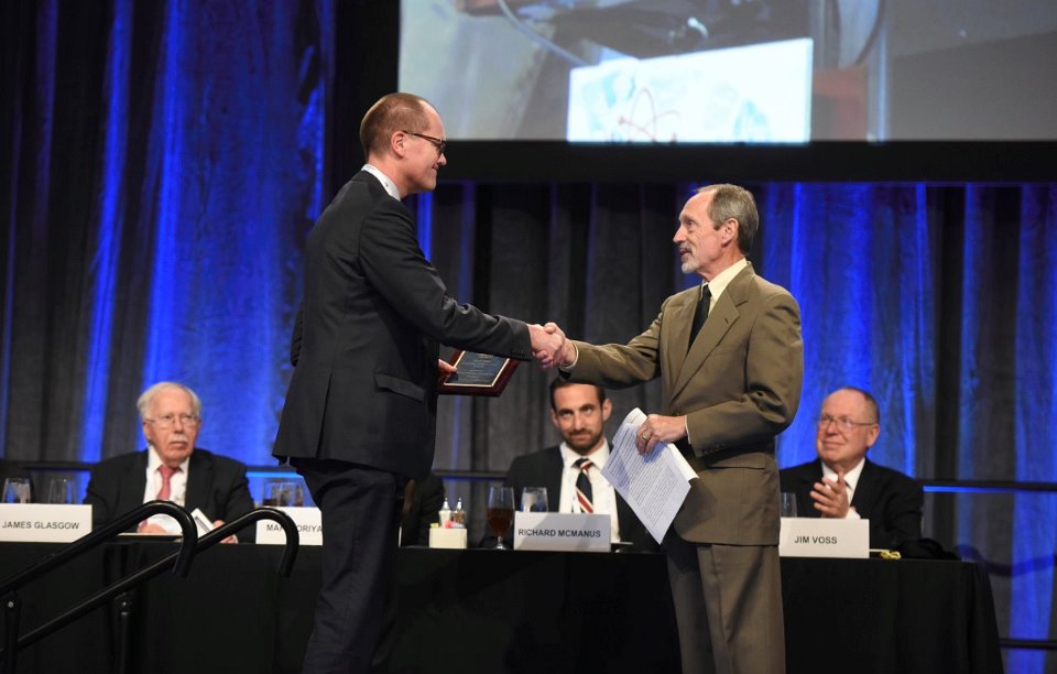 11 "Dr. Thilo von Berlepsch of DBE TECHNOLOGY GmbH, accepting the WMS/Wendell D. Weart Lifetime Achievement Award from Paul Shoemaker. Dr. von Berlepsch accepted the award on behalf of the late Dr. Enrique Biurrun