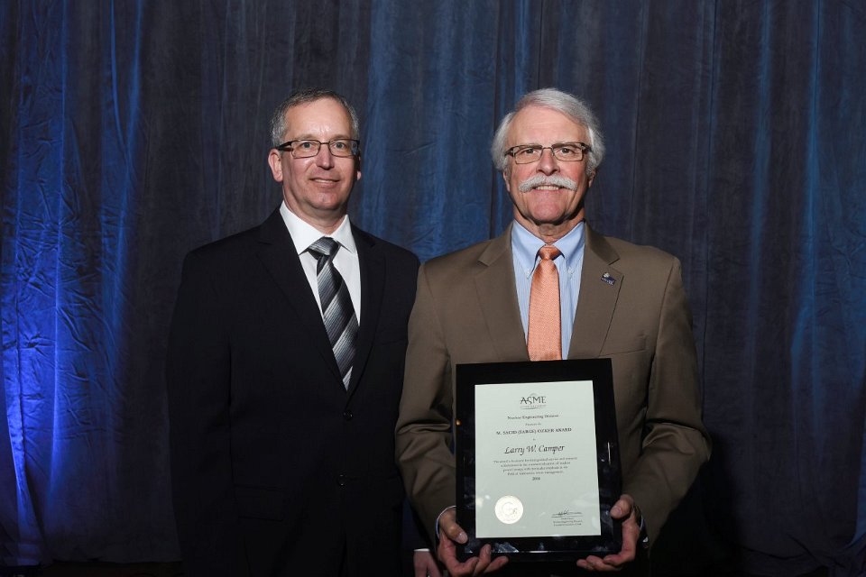 7 "Gary Benda presenting the WM2015 ANS Best Oral Presentation/Paper, ""The Development and Initial Testing of the Ice Pig Cleaning Method for Nuclear Reprocessing Plants"" – Track 6, D&D, to Tom Scott, Sellafield Ltd. (Mr. Scott accepted the award on behalf of Alex Jenkins with Sellafield Ltd; Joe Quarini and Day McBryde, University of Bristol)