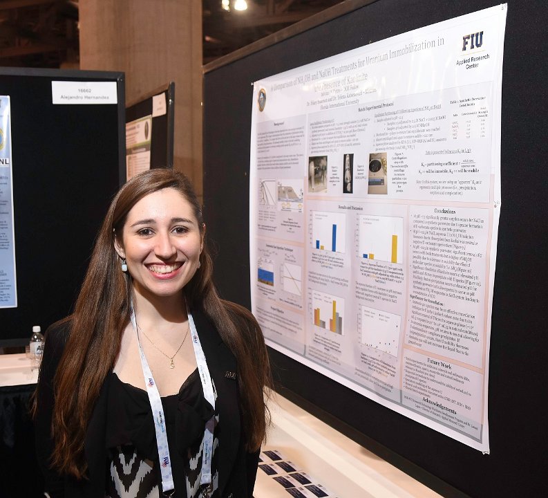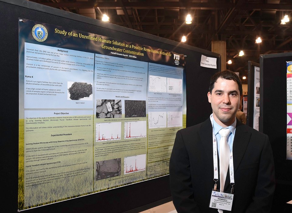 13 Student Poster: " Study of an Unrefined Humate Solution as a Possible Remediation Method for Groundwater Contamination at SRS", Hansell Gonzalez Raymat (pictured), Yelena Katsenovich, Leonel Lagos, Applied Research Center - FIU