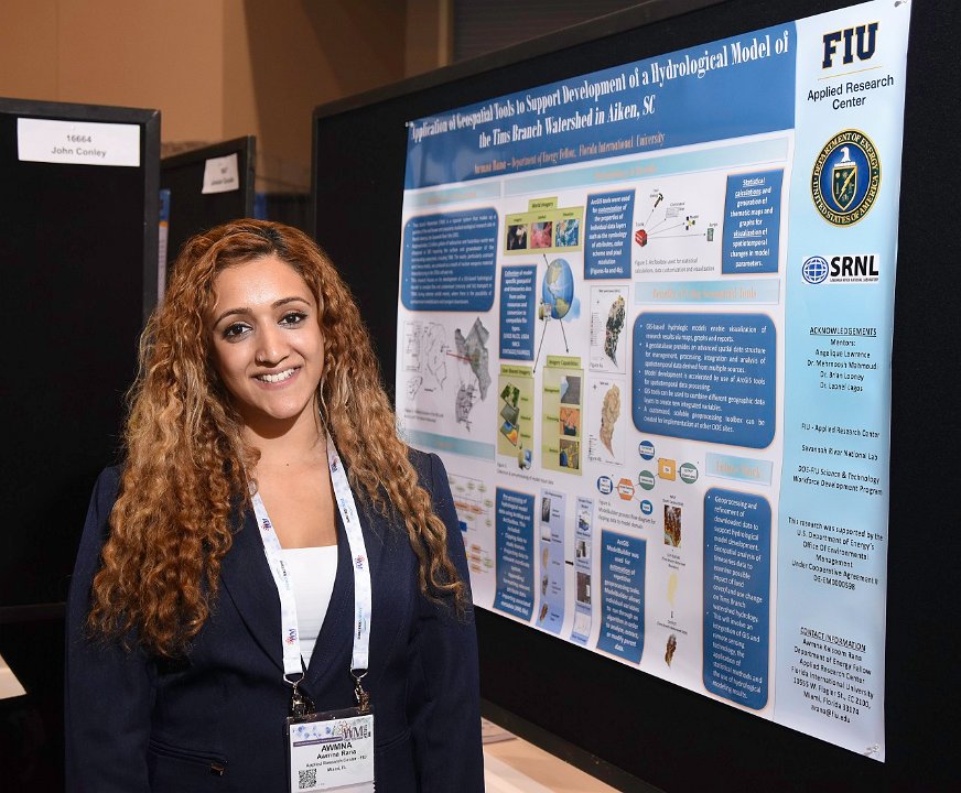 16 Student Poster: "Application of Geospatial Tools to Support Development of a Hydrological Model of the Tims Branch Watershed, Aiken, SC", Awmna Rana (pictured), Angelique Lawrence, Mehrnoosh Mahmoudi, Shimelis Setegn, Applied Research Center - FIU