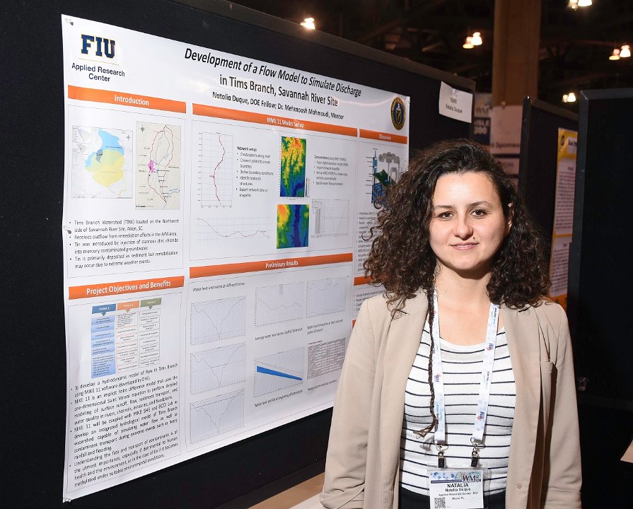 28 "Student Poster: ""A Model to Simulate Flow in Tims Branch, Savannah River Site, SC "", Natalia Duque (pictured), Mehrnoosh Mahmoudi, Angelique Lawrence, Shimelis Setegn, Applied Research Center - FIU"