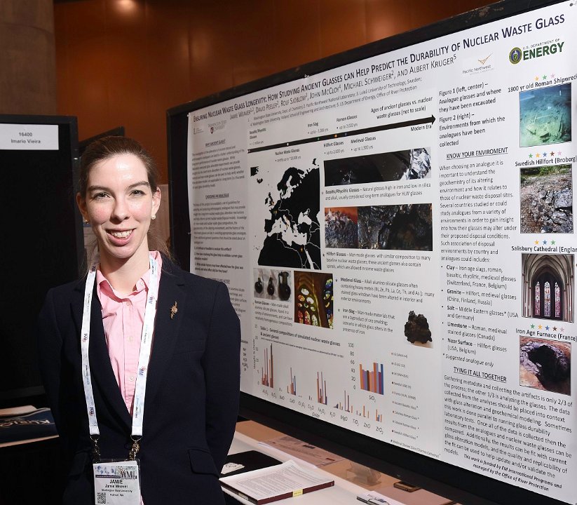 3 Student Poster:" Ensuring Nuclear Waste Galass Longevity: How Studying Ancient Glasses can Help Predict the Durability of Nuclear Waste Glass", Jamie Weaver (pictured), Nathalie Wall, John McCloy, Washington State University; Rolf Sjoblom, Lulea University of Technology: David Peeler, Michael Schweiger, Pacific Northwest Laboratory: Albert Kruger, US DOE
