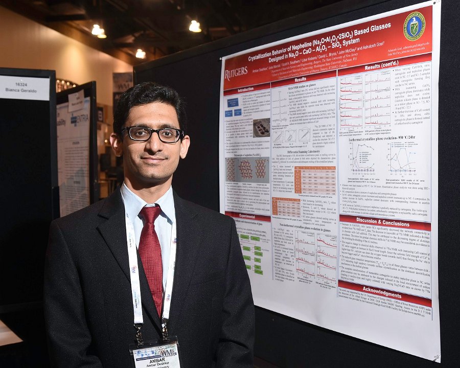7 "Student Poster: ""Crystallization Behavior of Nepheline(Na2O•Al2O3•2SiO2) Based Glasses Designed in Na2O – CaO – Al2O3 – SiO2 System"", Ambar Deshkar (pictured), Ashutosh Goel, Rutgers University; Scott Southern, Libor Kobera, David Bryce, University of Ottawa (Canada); John McCloy, Jose Marcial, Washington State University"